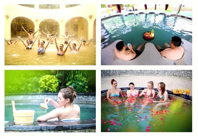 园国医国药温泉占地3万㎡,各式温泉池62个,根据“金木水火土”五行学说规划布局。