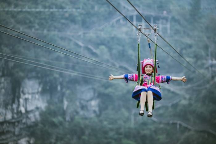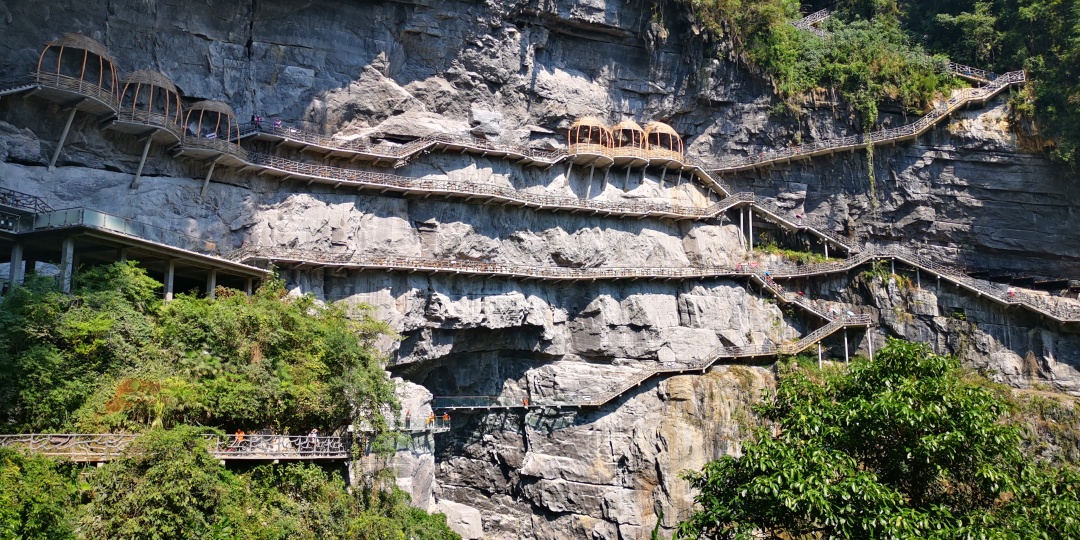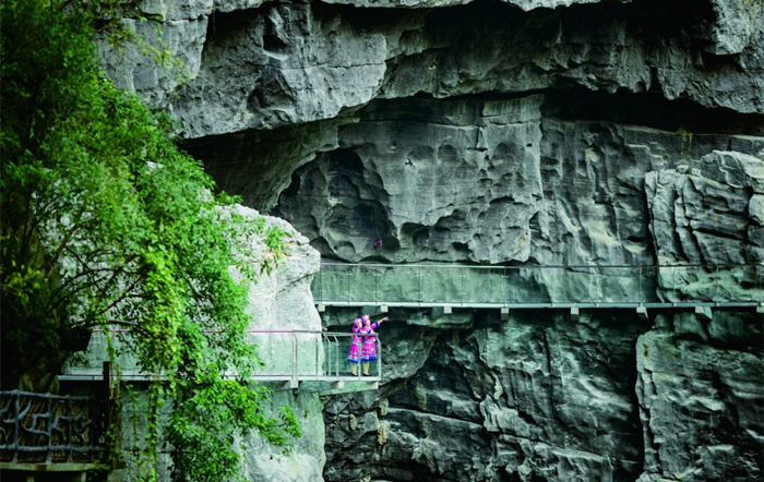 这里既是震撼的地质奇观,也是仫佬族非遗的展示舞台。喜欢刺激的可挑战悬崖玻璃栈道、飞拉达攀岩,在高空俯瞰天坑全景,感受肾上腺素飙升的快感;偏爱静谧的可漫步悬崖书店,在书香与山风中放空,或打卡无边泳池,随手拍出氛围感大片。