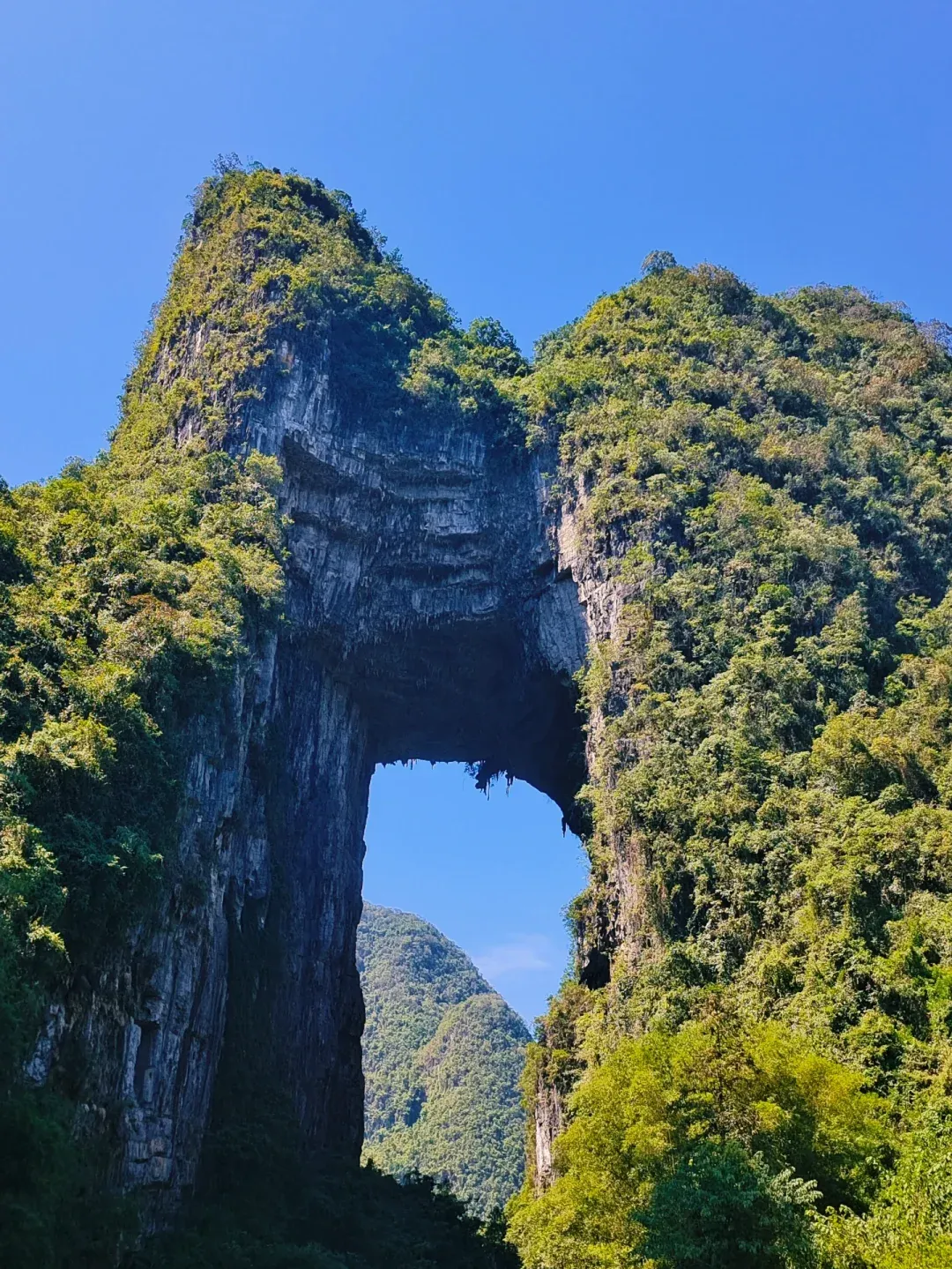 继续前往天门山,天门山是罗城标志性景观之一,因山体自然形成一道巨大的“天门”而得名,山体巍峨险峻,天门洞开阔通透,阳光穿过洞口时形成绝美光影,是摄影必打卡点。可沿登山步道登顶(全程约40分钟,难度适中),登顶后可俯瞰周边峰林与田园风光,景色壮阔。