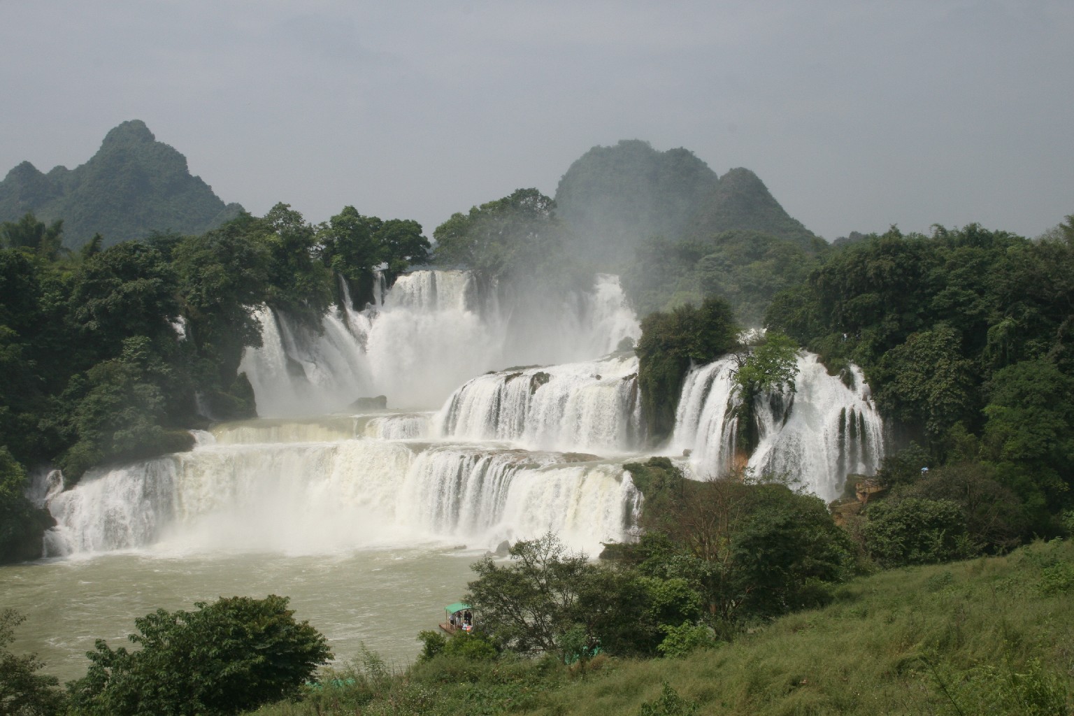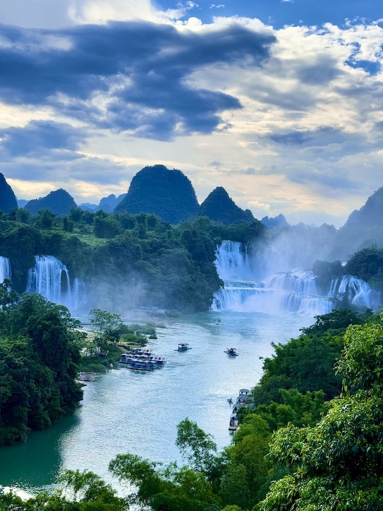 位于中越边境,与越南板约瀑布相连,是亚洲第一、世界第四大跨国瀑布,国家5A级旅游景区,以三级叠瀑风光为核心特色。