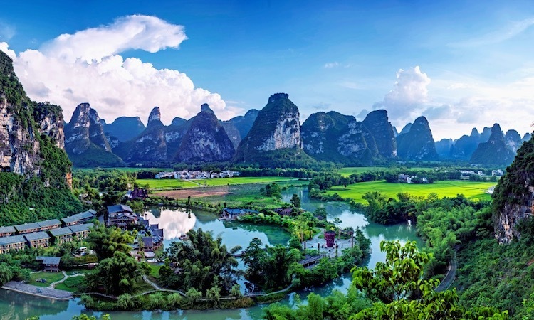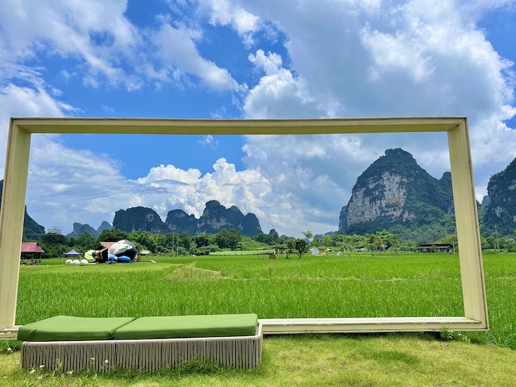 半山观景台可俯瞰泉池、稻田与喀斯特峰林全景