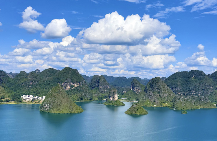 它被誉为"水上桂林"、"大里的海洋”。湖中有十多个大小岛屿,四周环绕着喀斯特峰林,沿岸点缀着几百个壮族干栏式村寨,湖面平静如镜,景色如画。