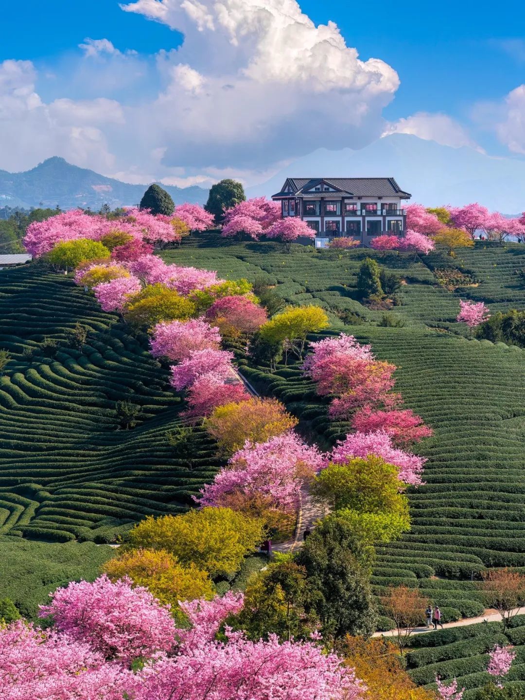 漫步其中,茶绿樱红、云雾缭绕,视觉效果超级震撼,