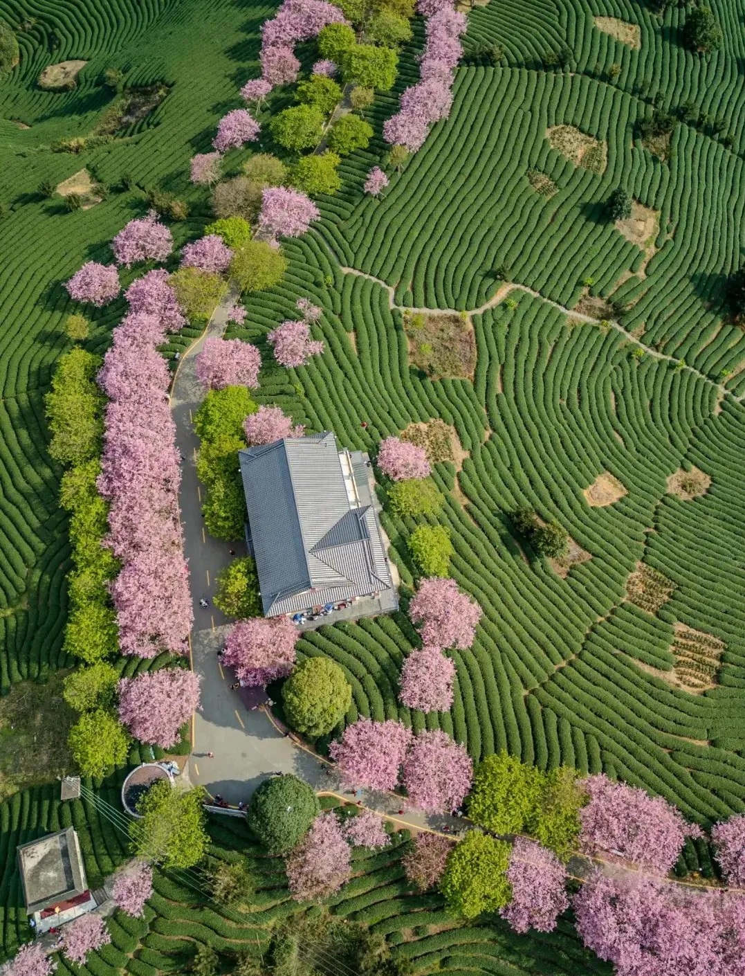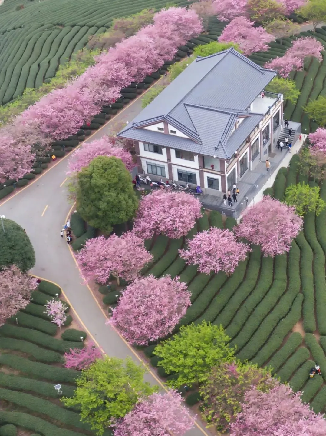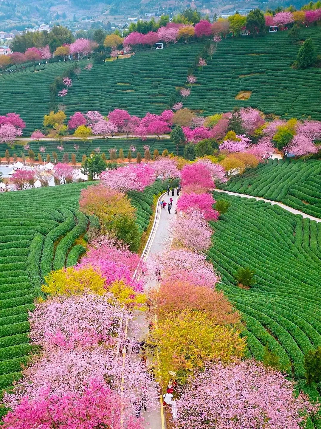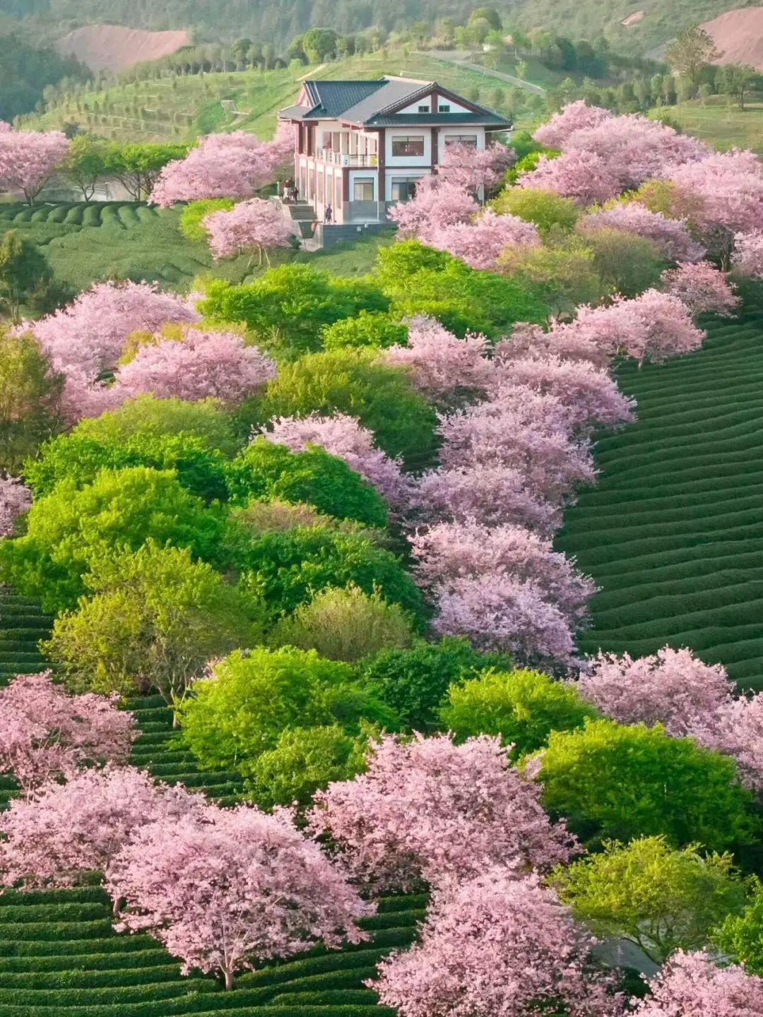 10万株樱花盛开在5万亩的茶园内茶绿樱红,美得震撼!