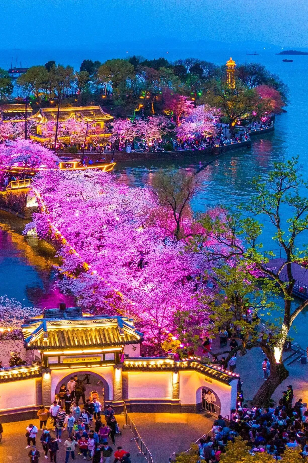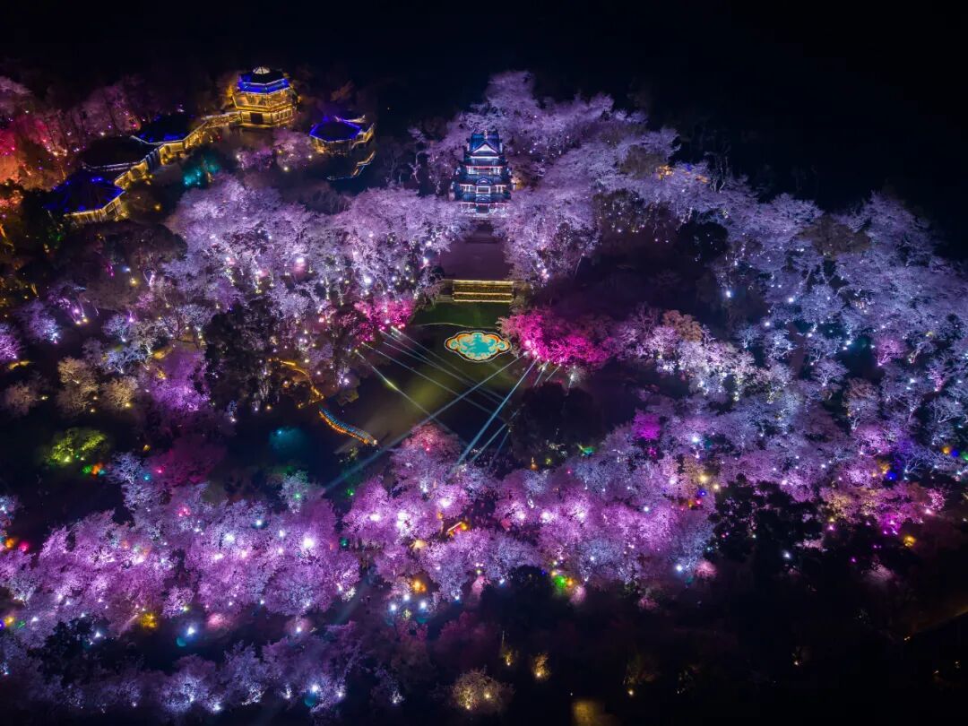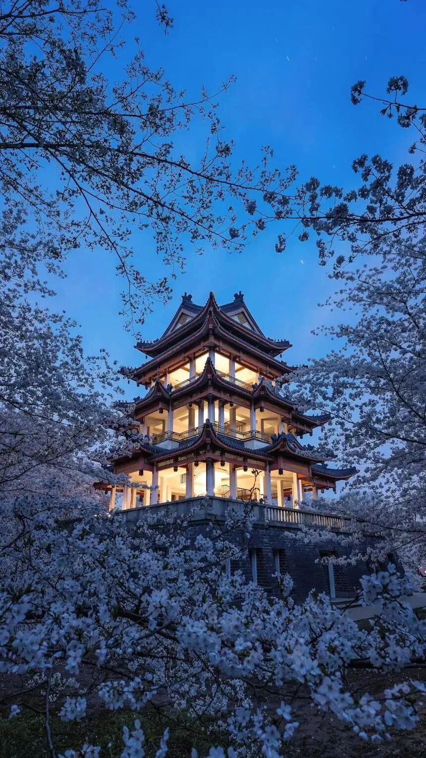 华灯初上,鼋头渚的夜晚格外迷人。在樱花树下穿梭,看着这些樱花,享受着浪漫樱花带来的视觉盛宴!夜色为樱花镀上滤镜,光影交错。白日的喧嚣褪去,只剩花瓣与星光的私语!随风飘落的花瓣点缀着夜晚的天空,像极了冬日里的皑皑白雪。樱花雨中漫步,别有一番趣味。这是樱花留给春天最后的浪漫,不负春光,总要在春天邂逅一场樱花雨吧!