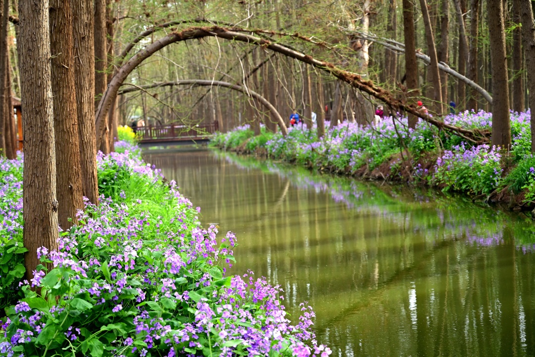 高大的水杉林透出层层绿意,紫色的二月兰在林荫里静寂的延伸展姿,行林岸花道,静水如镜,顾盼留连,千姿百态的水杉树根,自然雕啄,巧夺天工。