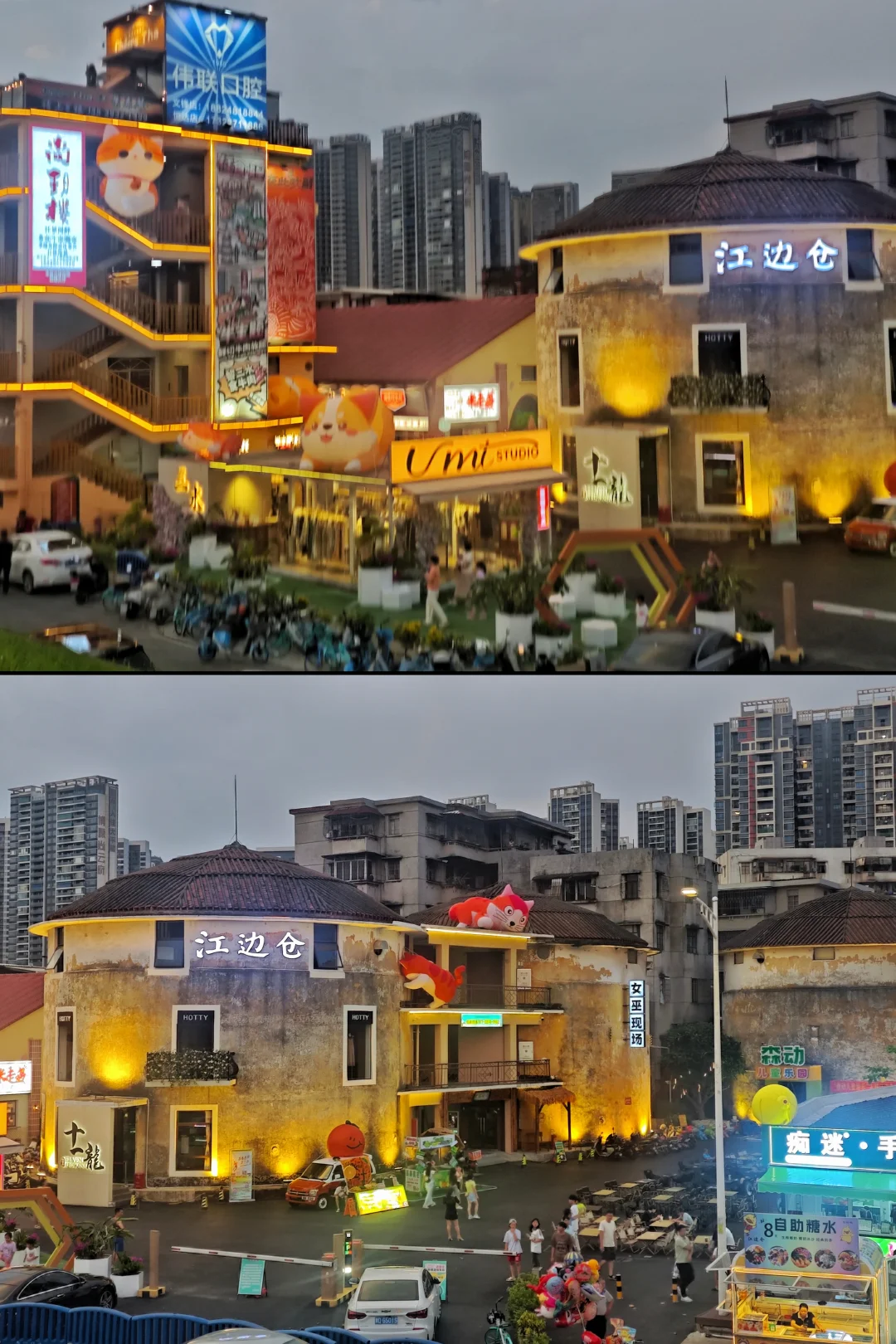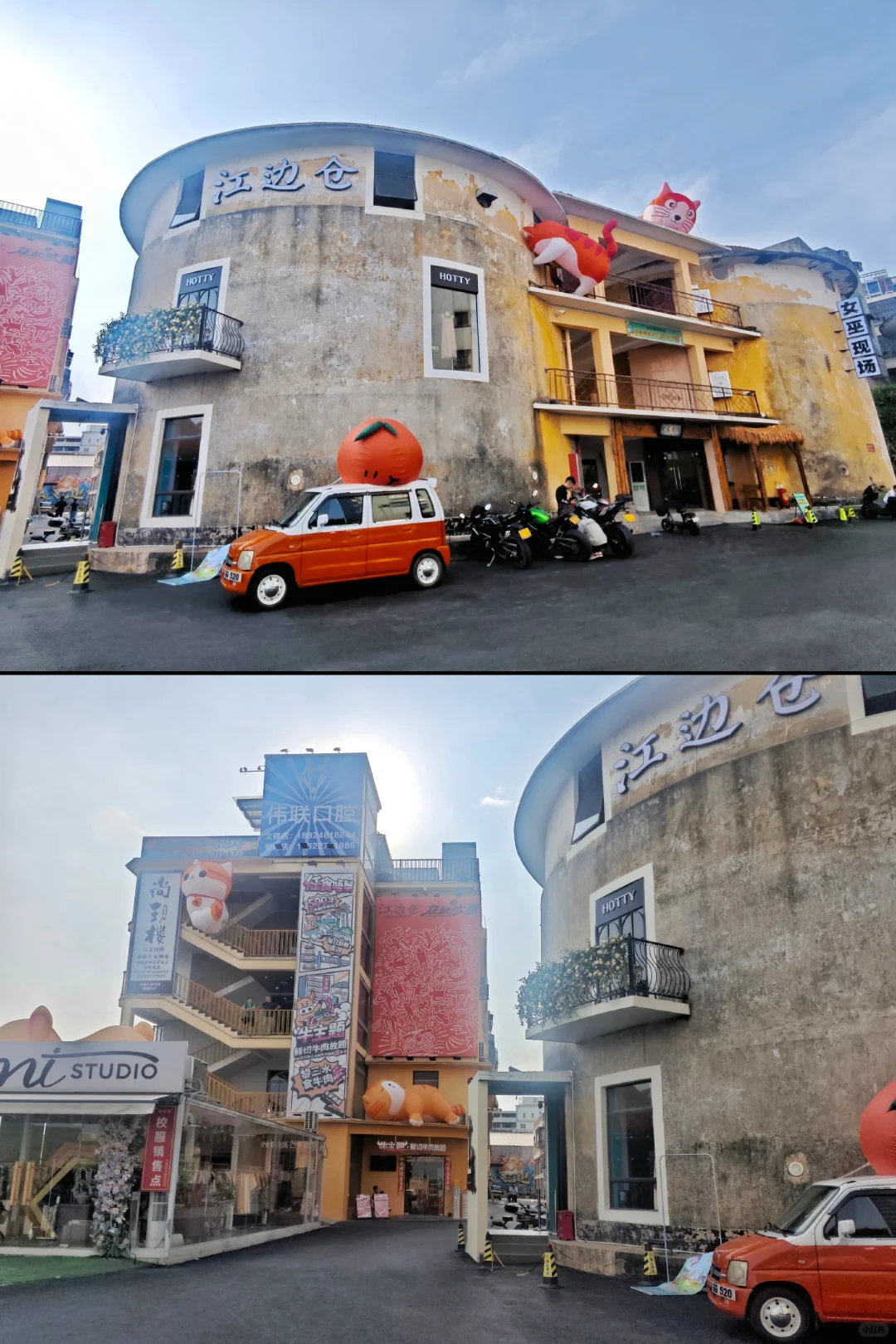 10:00 出发第一个景点江边仓1982创意街,这里的旧粮仓改造得超有味道,4 座砖圆仓复古又文艺,傍晚时分,夕阳洒在江面和仓群上,美景随手可得。