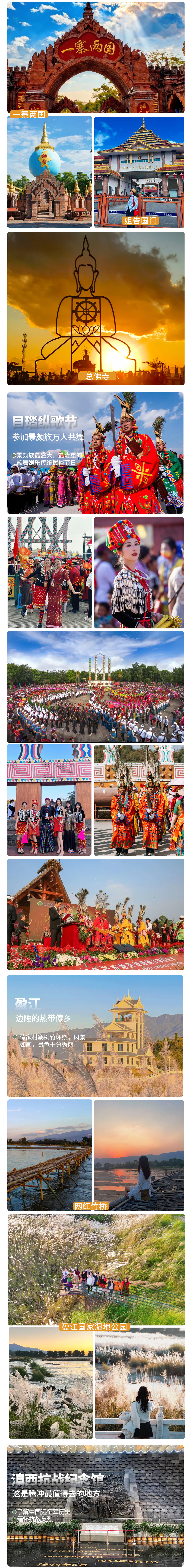 3.【异域风情】不用出国,在这里你就能体验到东南亚异域风情。热带雨林、佛寺佛塔、边关人文、青青草原、秘境古村、民族风情、休闲古镇、泡野温泉、徒步体验等众多元素结合。