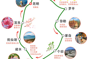 车程:建水—宜良樱花谷,约200公里,行车约2.5小时;宜良樱花谷—昆明,约80公里,行程约1.5小时;