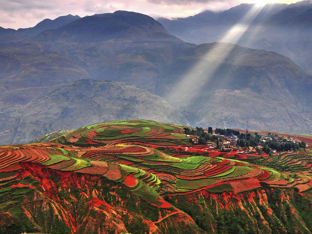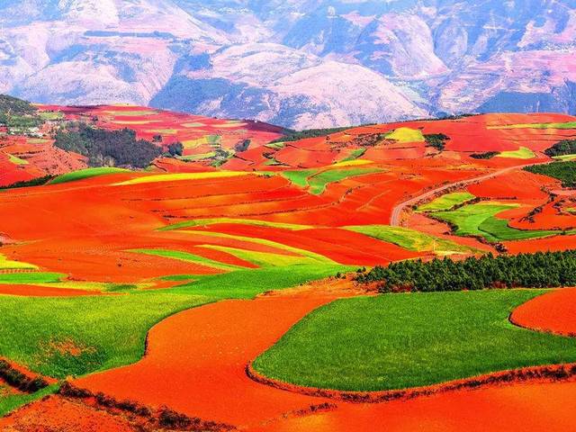 之后行车约4.5小时左右到达【东川红土地】。先沿途拍摄线条流畅的【乐谱凹】,然后前往【落霞沟】,这里的红土地上映出朵朵白云,忽明忽暗,顺光高点红土地会呈现出艳丽的光影。放眼望去,仿佛是天公涂抹的板块一样斑斓炫目。