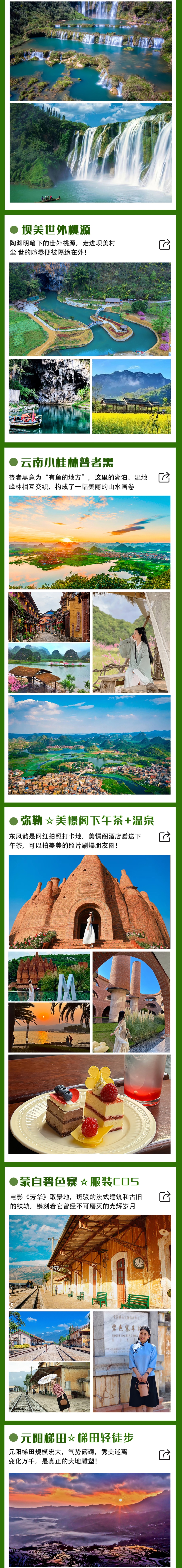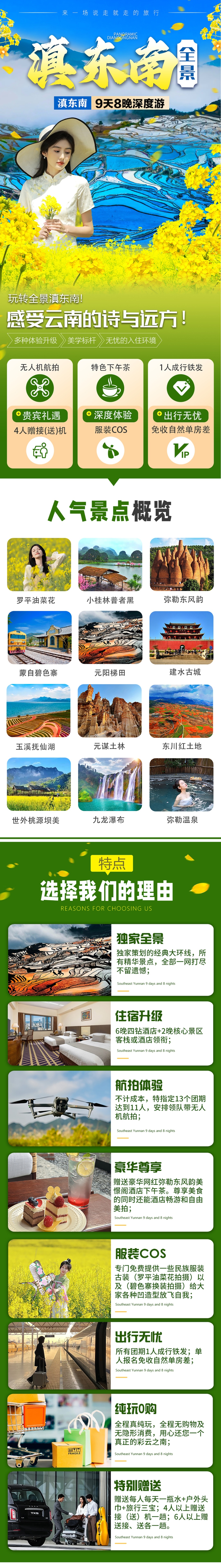 1. 【独家全景】:独家策划的经典滇东南大环线,所有精华景点,全部一网打尽,不留遗憾。前往《庆余年》《芳华》《三生三世》等影视拍摄地,以及万花筒艺术馆《东风韵》只带您在最美的季节看醉美的风景。
