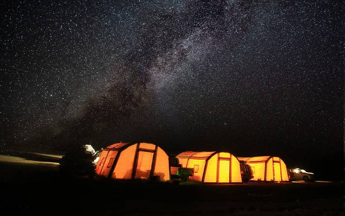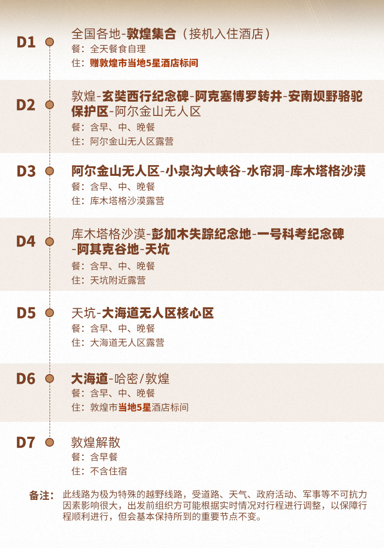 【行程概述】第一缕阳光洒在大漠中,追光者早已架起设备疯狂捕捉,日出拍摄活动结束后,厨师早已为大家准备好热腾腾的早餐。吃过早餐,开始新一天的征程,我们向“光”而行,感受薪火相传的国家力量。彭加木,中国生物化学家、革命烈士,曾多次进入罗布泊开展科研工作,为中国的植物病毒研究做出了大量的贡献。如今,他脚步最后消失的地方纪念碑已不复存在,但他的足迹仍旧停留于此。【彭加木失踪纪念地】不是一处景点,而是心灵对话之地,国与家,奉献与收获。拜别了彭加木,我们赶往【一号科考纪念碑】,这是2003年中科院科考队考察罗布泊时建立的第一个营地。我们继续前行,去探秘沙漠中最像月球的地方【阿奇克谷地】。松软的细沙、低矮的沙丘、平均风速最小、降雨量最小,是最适合实验月球车的地方。“玉兔”号月球车在月表开始漫步之前,已在这里行走一个月。如今我们还可以看到各种实验残骸,国家的力量在这里得以彰显。一起去寻宝吧,在去往【天坑】的路上沿途分布着奇石滩涂,只要你有一双发现美的眼睛,必能收获属于自己的奇石美玉,还有机会偶遇“恐龙蛋”哦,晚上我们便露营于此。