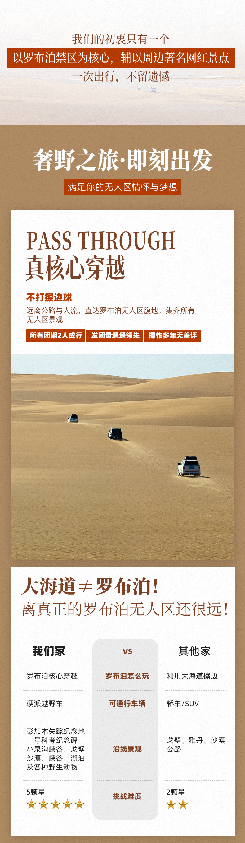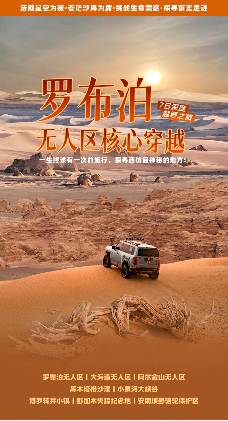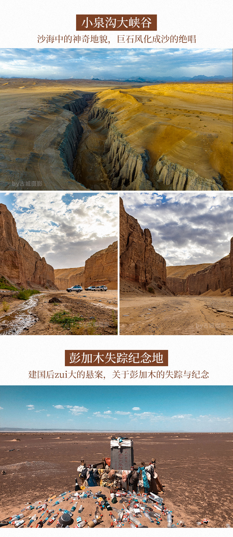 罗布泊无人区+大海道无人区+阿尔金山无人区+库木塔格沙漠+小泉沟大峡谷+博罗转井小镇+彭加木失踪纪念地+安南坝野骆驼保护区