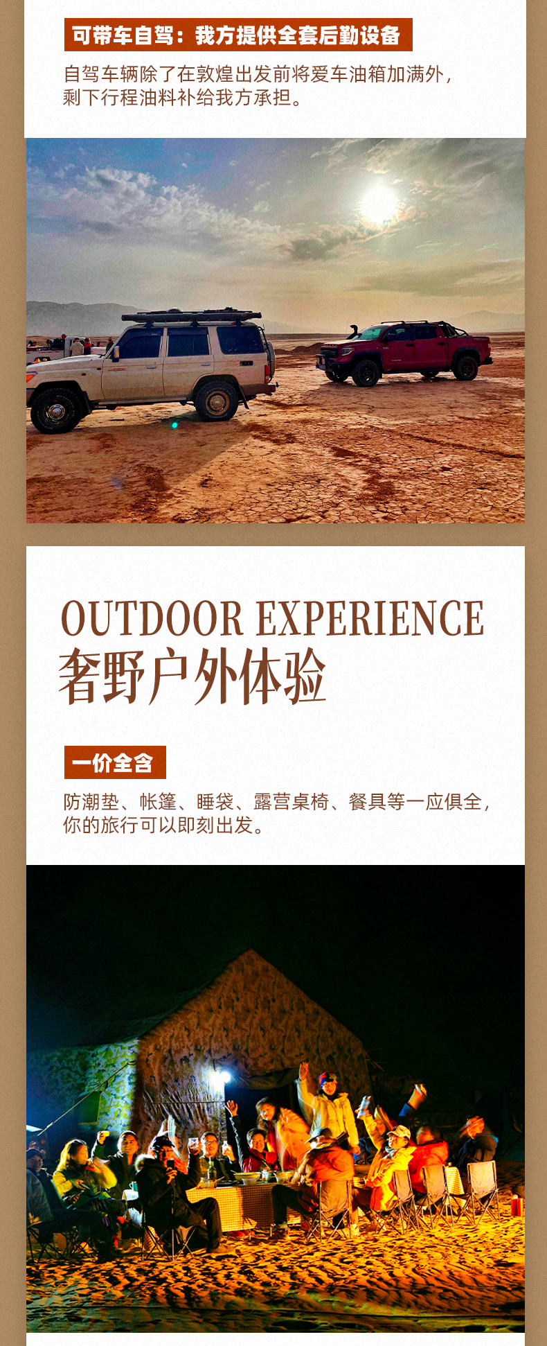 沙海、戈壁、落日、银河、星轨、雪山、峡谷、河道、野生动物、野外露营、篝火晚会、特色服装、滑沙体验、热汤火锅、沙漠BBQ、绚丽烟火等等,你想要的,我们会一一奉上。