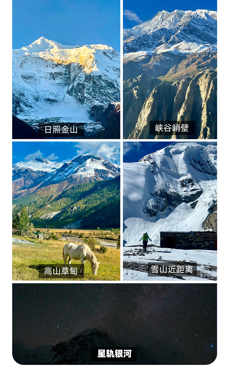 【行程概述】今日在Manang休整1天,适应高海拔环境。可以进行适应性徒步,前往附近的藏传寺庙或短途徒步路线。Manang周边群山环抱,可欣赏到安娜普尔纳、岗嘎普尔纳等巨峰的壮丽景色。荒原雪山日落尤为壮观,金色阳光洒在雪山上,形成"日照金山"奇观。Manang还拥有古老藏传佛教寺庙,转经筒、玛尼堆和壁画展示了深厚的宗教文化底蕴。